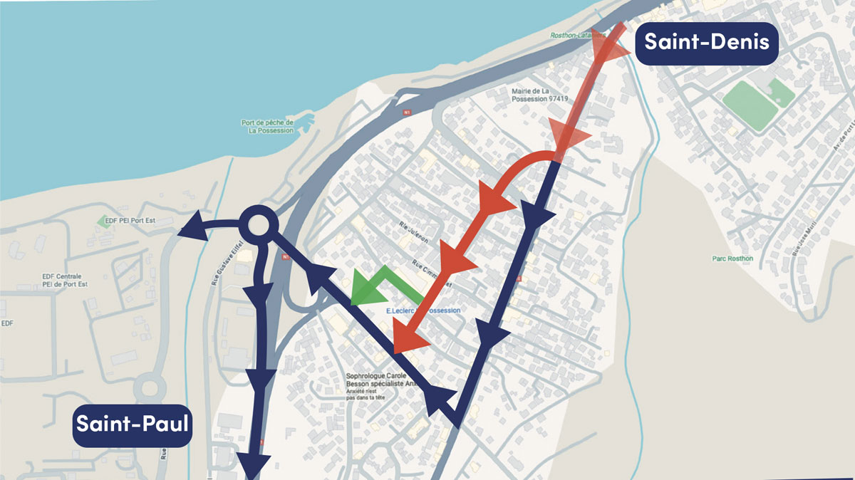 Trois itinéraires ont été aménagés en centre-ville de la Possession pour rejoindre la RN1 en direction de l’Ouest.
